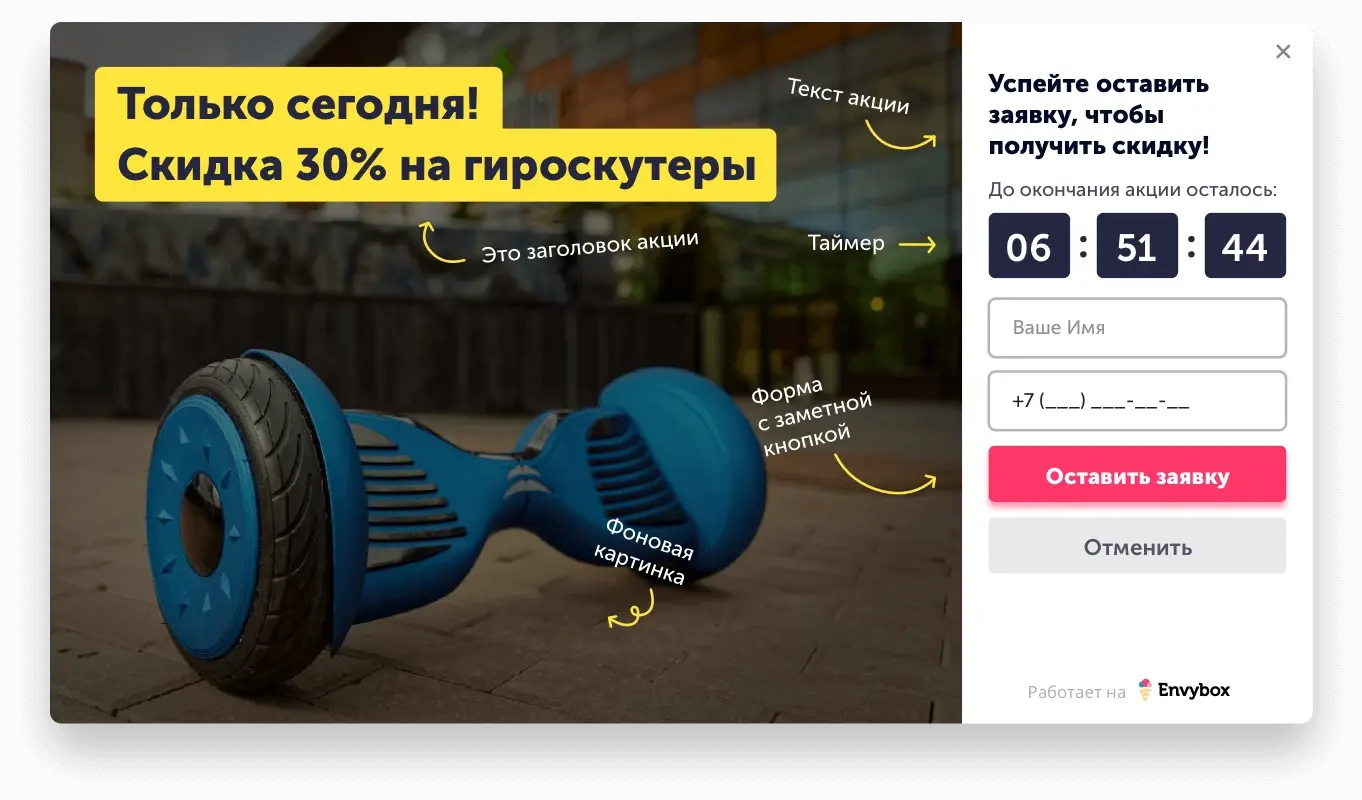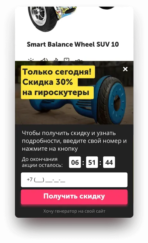 Настроим виджет сборщик лидов в соответствии со стилем Вашего сайта. Уникальный дизайн повысит доверие посетителей и станет эффективным инструментом для реализации товаров и услуг, а всплывающее окно с акцией и таймером обязательно привлечет внимание потенциального покупателя/заказчика.